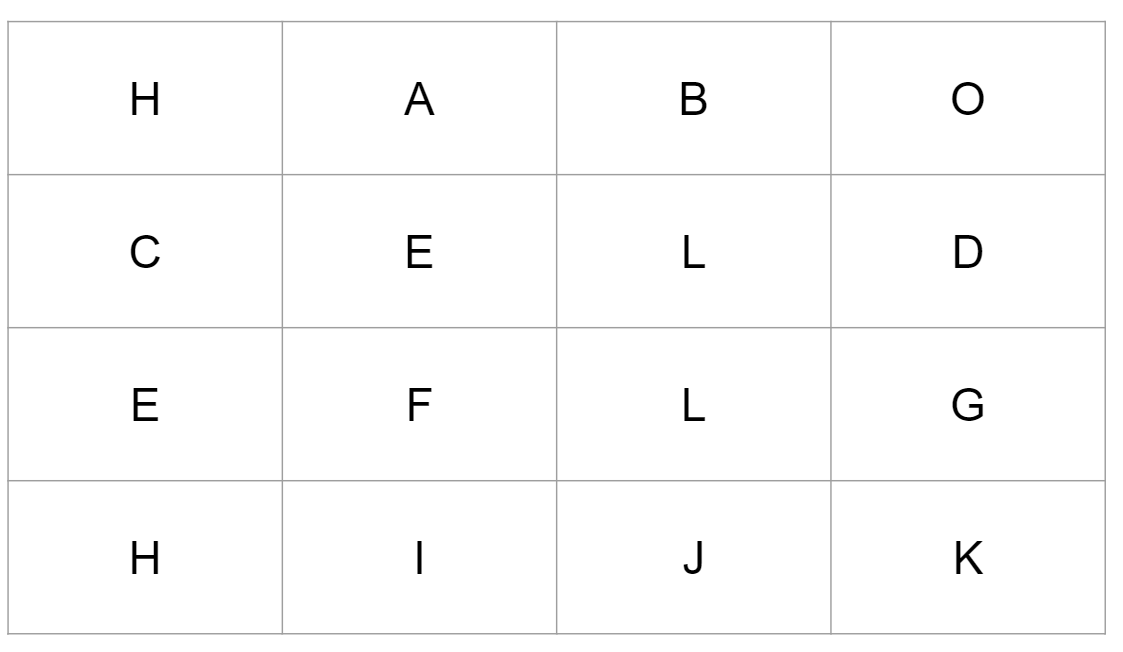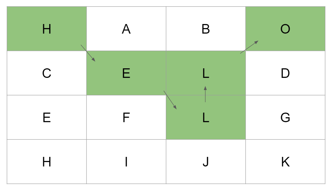 예를 들어 Hello라는 단어가 주어지고 다음과 같은 게임판이 주어졌다고 가정해봅시다.