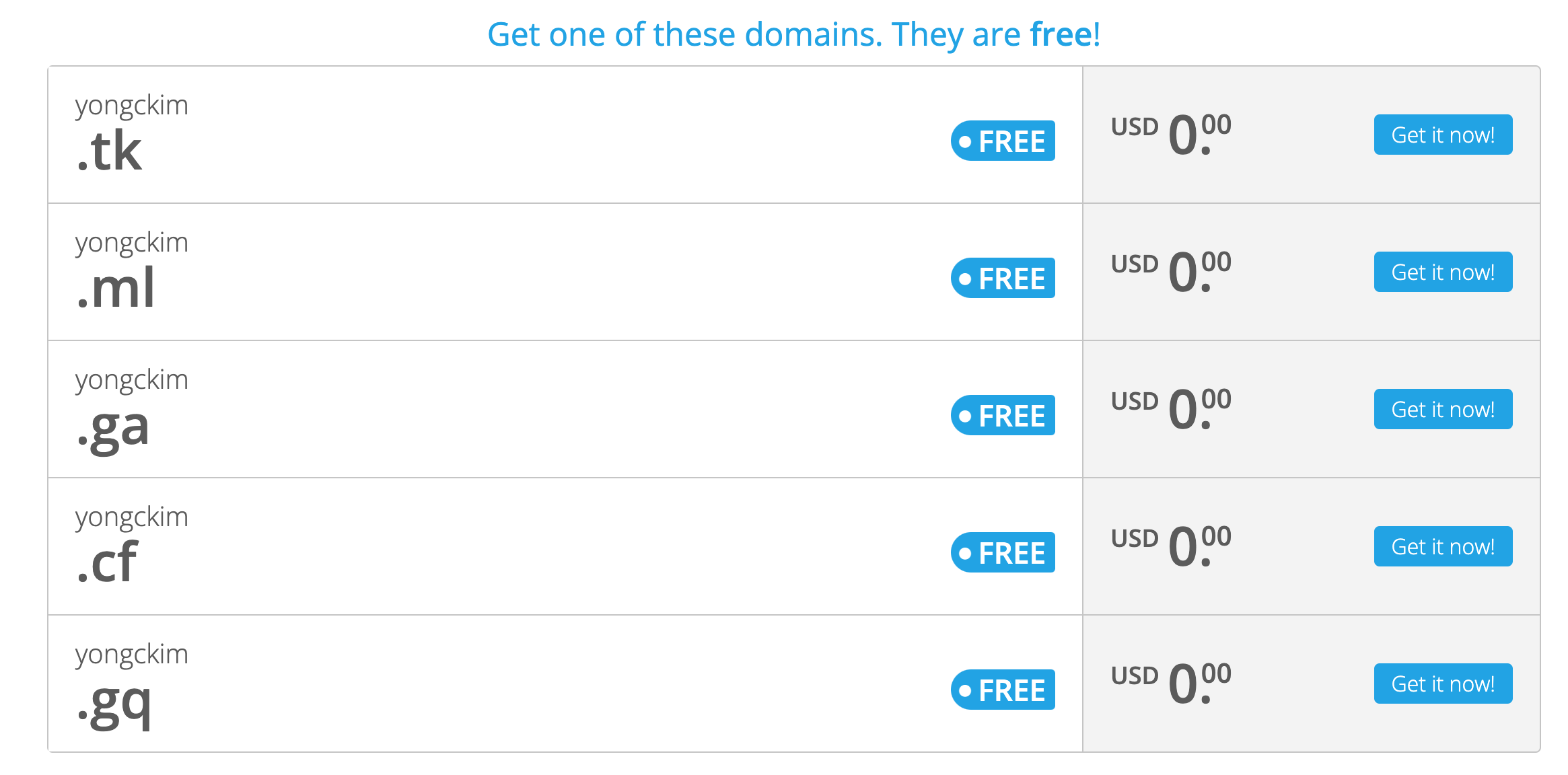 해당 사이트는 특정 도메인을 1년간 무료 사용할 수 있는 장점이 있습니다.