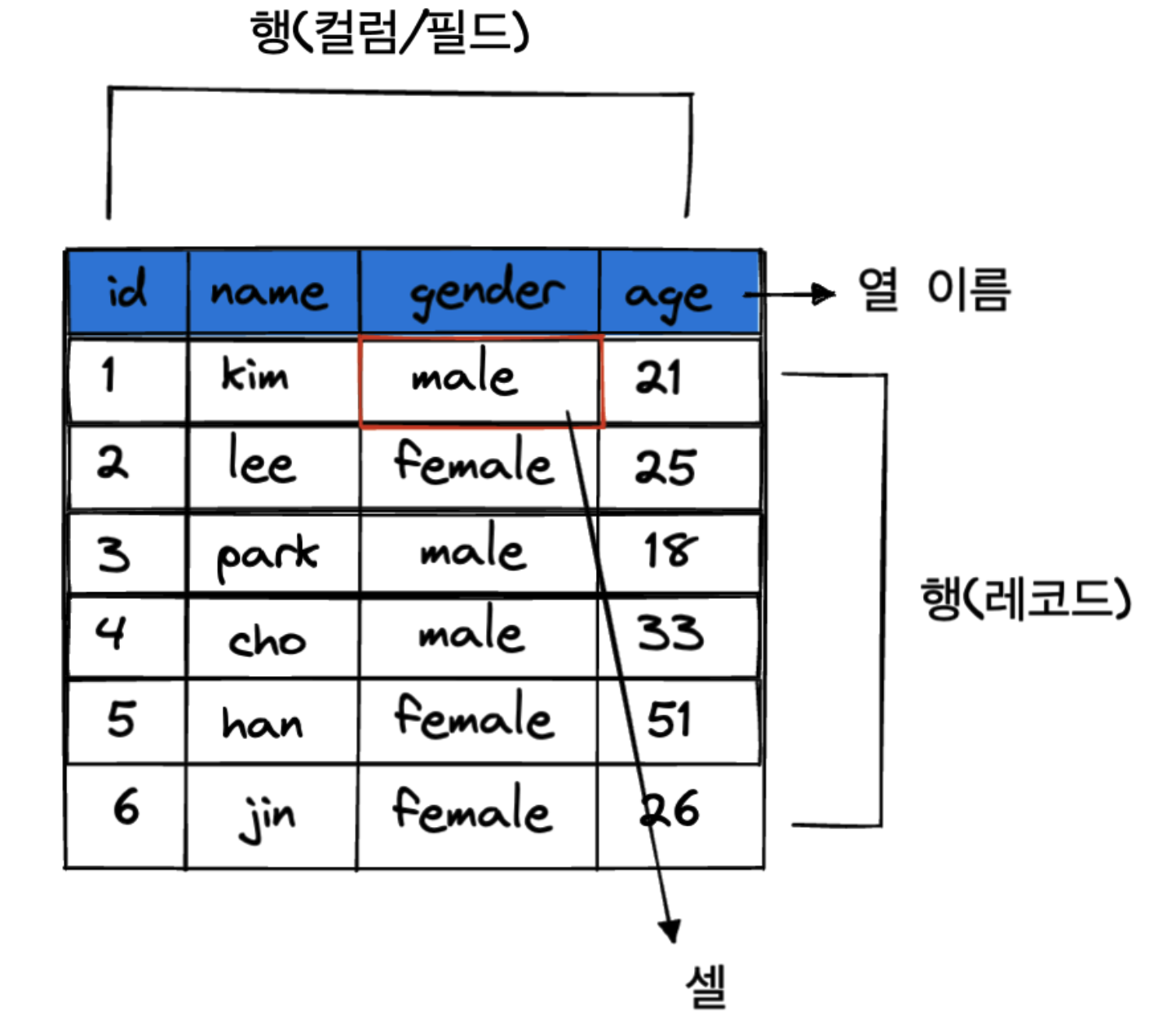 표 형식의 데이터는 행(레코드)과 열(컬럼/필드)로 구성됩니다.