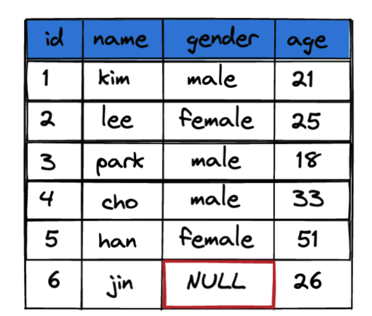 위의 테이블을 보면 셀의 값이 NULL로 표시된 부분이 있습니다.
