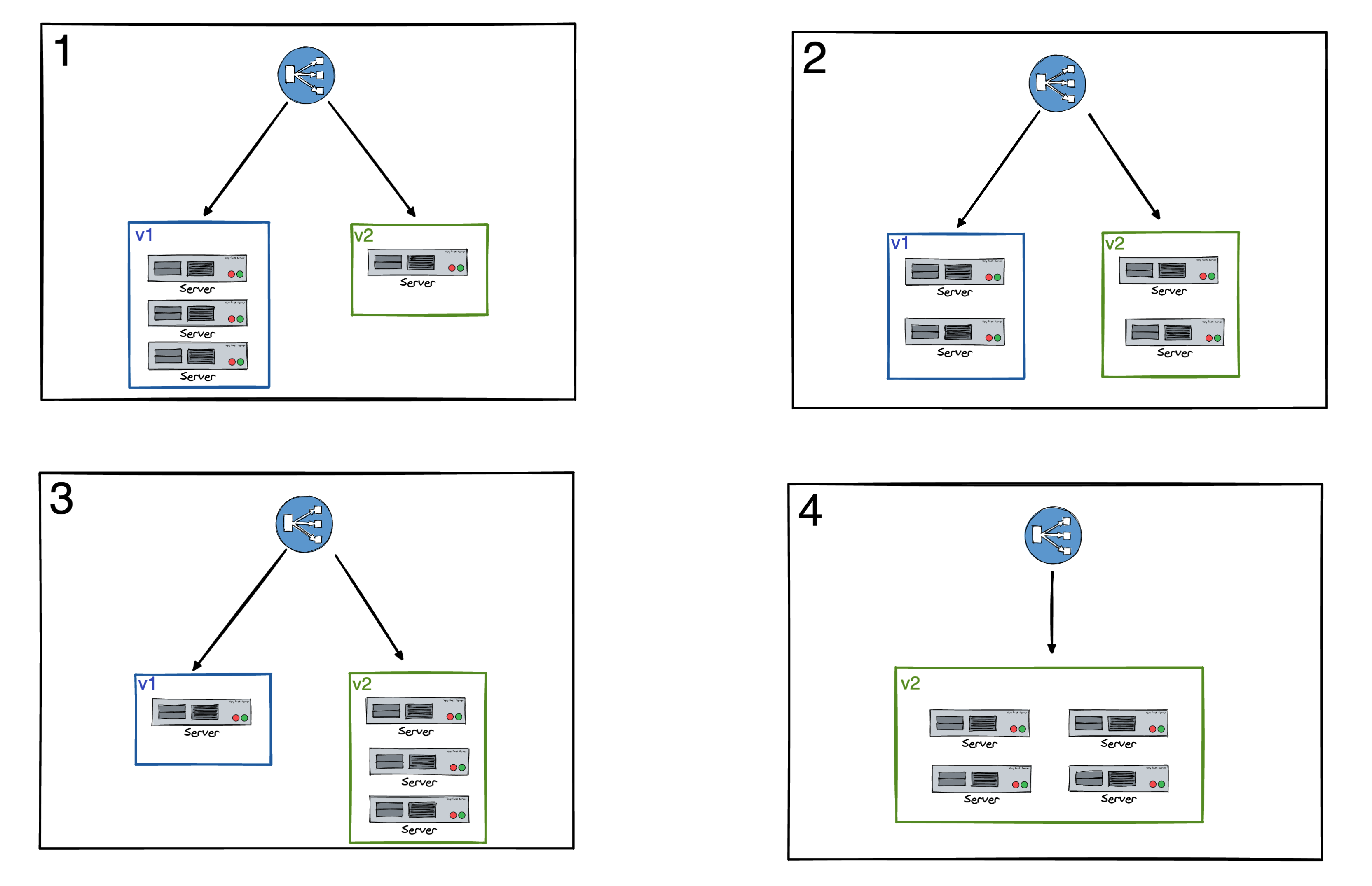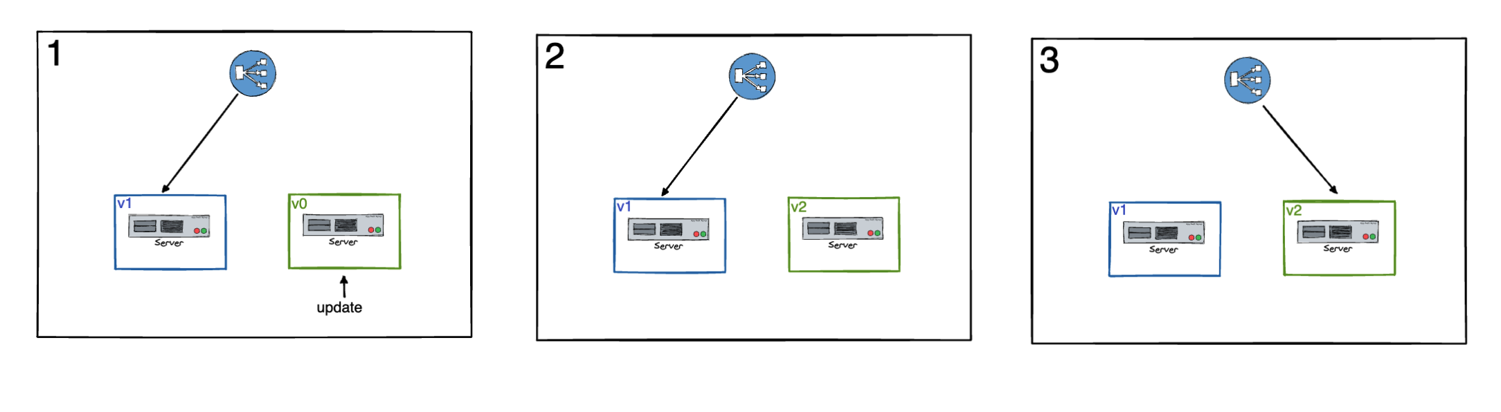- 배포가 진행될 때 이전 버전과 새로운 버전이 공존할 수 있기 때문에 사용 중 호환성 문제가 발생할 수 있습니다. 위의 그림에서 2번의 경우 사용자는 v1으로도 서비스를 제공받을 수 있고 v2로도 서비스를 제공받을 수 있기 때문에 사용자들은 같은 서비스를 받는 것을 보장받지 못합니다.