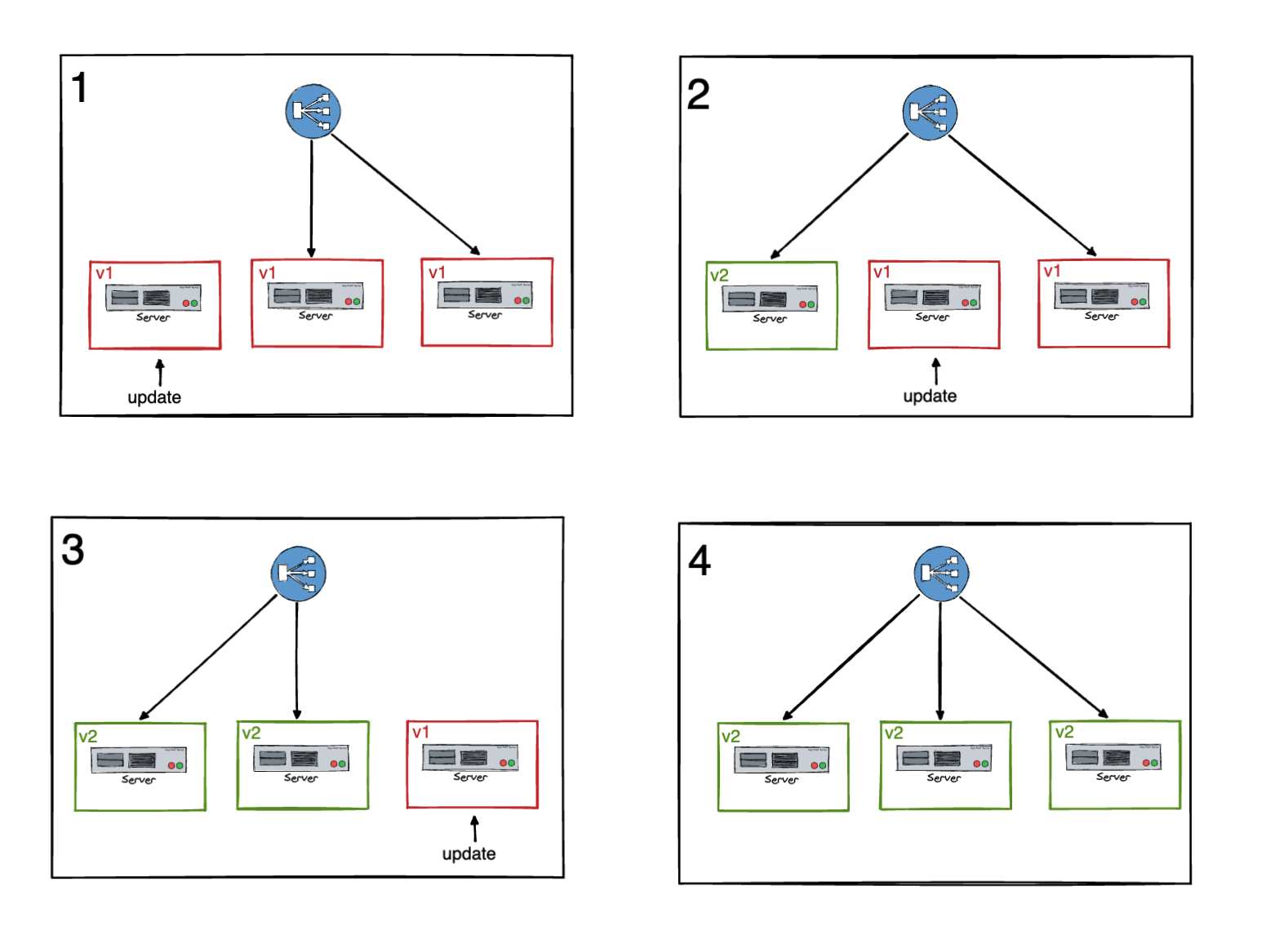 서비스 중인 인스턴스 하나를 로드밸런서에서 라우팅하지 않도록 한 뒤, 새 버전을 적용한 후 다시 라우팅하도록 하는 방식입니다.