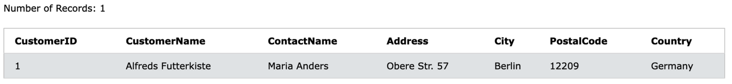 다음은 조건식을 활용하여 CustomerID가 1인 값만 조회하는 SQL 구문입니다.