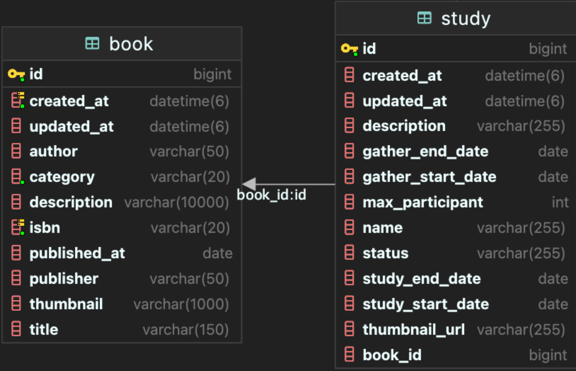 현재 책 정보를 저장한 테이블인 book과 스터디 정보를 저장한 study 테이블이 다음과 같이 존재하는 형태입니다.
