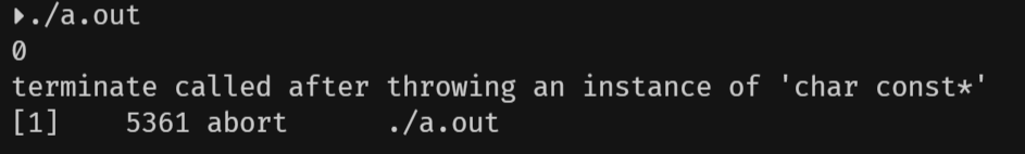 throw로 보낸 "잘못된 수를 입력하였습니다." 라는 문자열은 char const * 타입이고 catch로 받는 string과 다른 자료형이기 때문에 throw를 받는 catch문이 없어 에러가 발생하게 되어 종료된 것을 볼 수 있습니다.