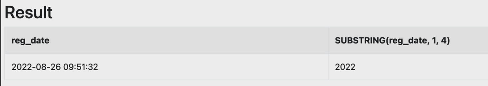 SELECT reg_date, SUBSTRING(reg_date, 1, 4) FROM mysql_test_a;