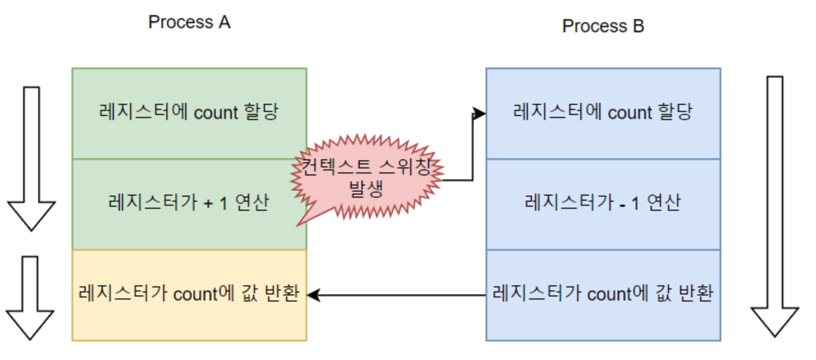 만약 2번 과정중에 컨텍스트 스위칭이 발생하여 프로세스 B가 실행된다고 가정해봅시다.