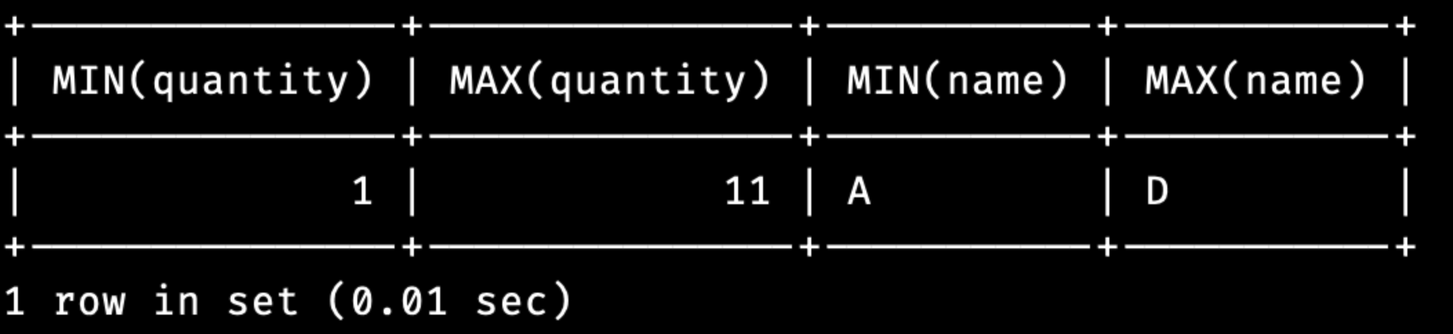 SELECT MIN(quantity), MAX(quantity), MIN(name), MAX(name) FROM product;