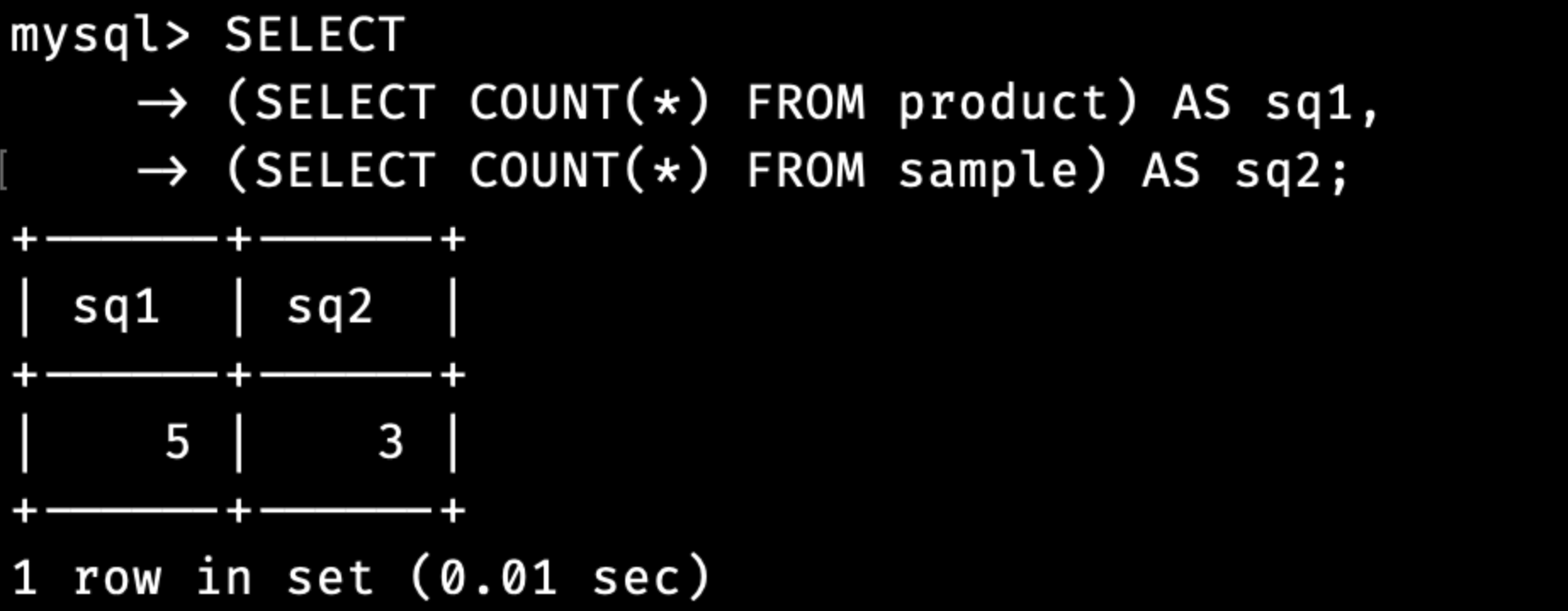 (SELECT COUNT(*) FROM sample) AS sq2;