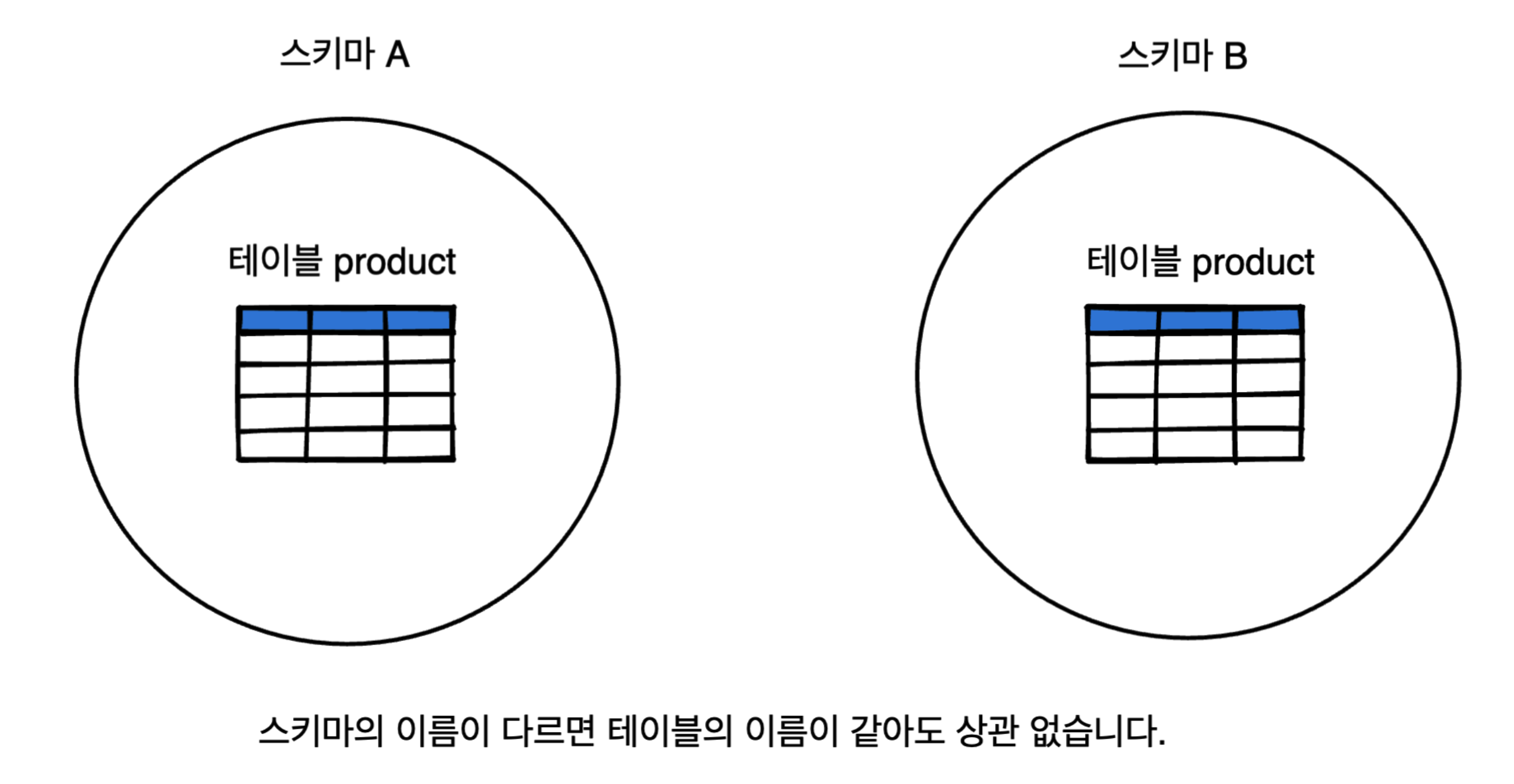 데이터베이스 객체는 스키마라는 그릇 안에 만들어집니다. 따라서 객체의 이름이 같아도 스키마가 서로 다르다면 상관없습니다.