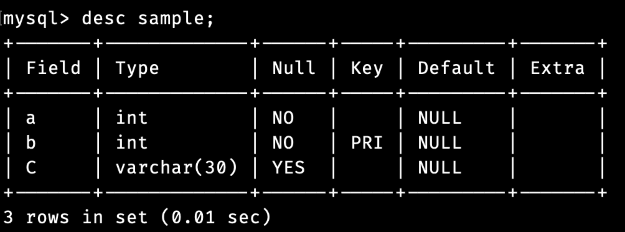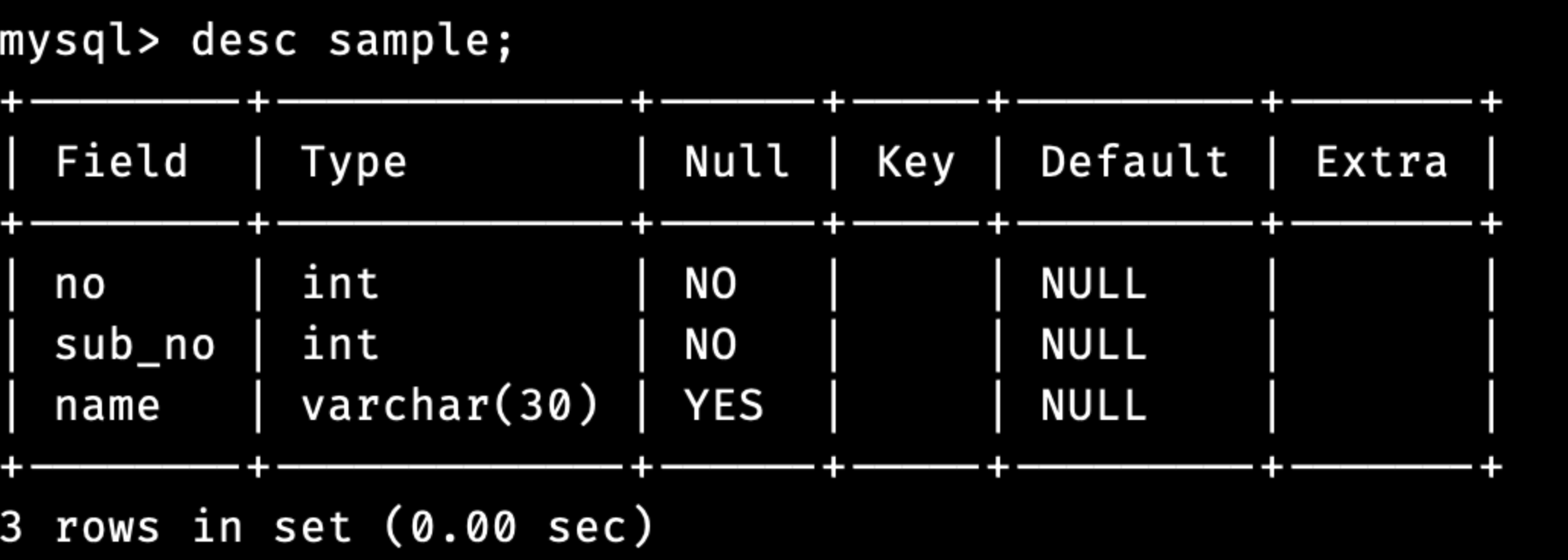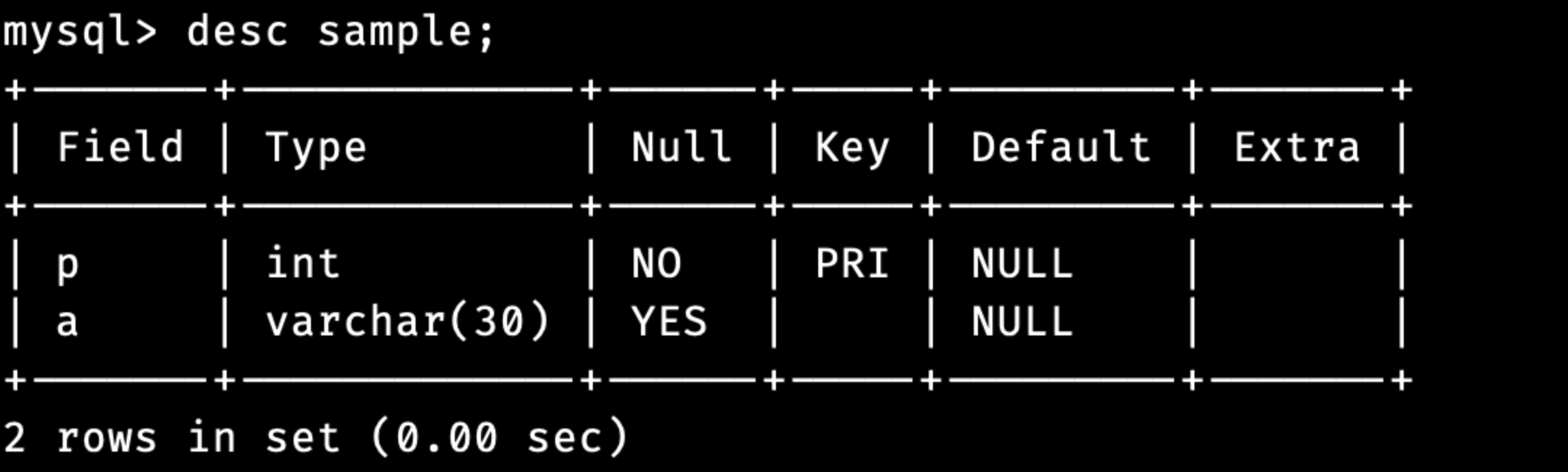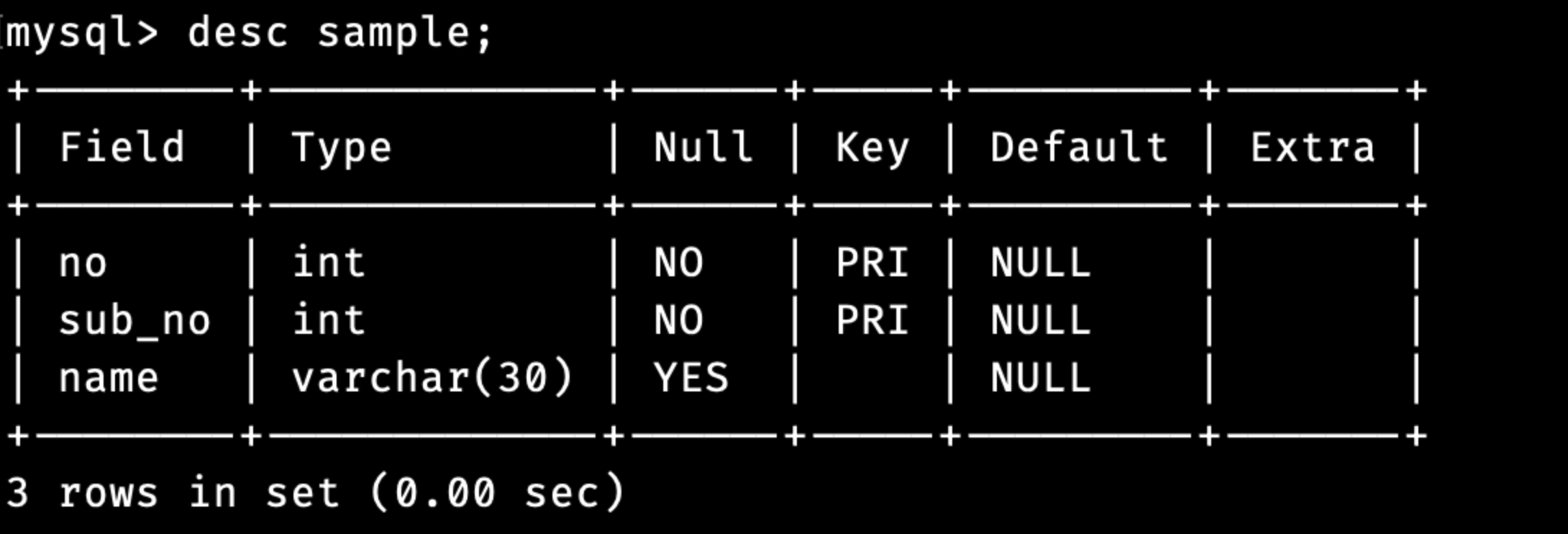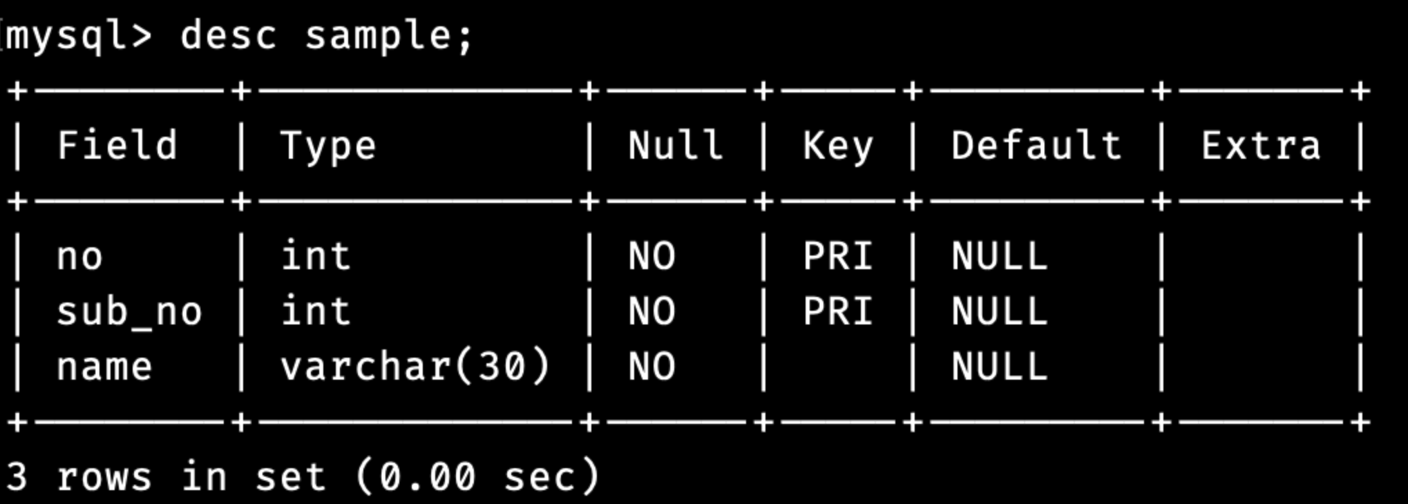 위의 테이블을 살펴보면 열 p가 sample 테이블의 기본키인 상태입니다. (참고로, 기본키로 지정할 열은 NOT NULL 제약이 설정되어야 합니다.)