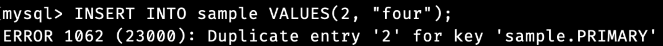간단히 말하면 기본키로 설정된 열이 중복하는 데이터 값을 가지면 제약에 위반됩니다.