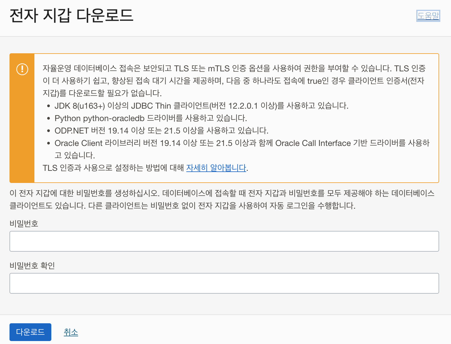 - 전자지갑을 이용하여 Oracle 자율운영 데이터베이스에 접속할 수 있다.