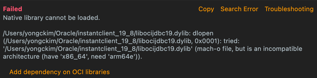 하지만 이 방법의 경우 Oracle에서 M1 MAC을 지원하지 않아서 아키텍처 문제로 계속 연결에 실패하였고 이에 대한 해결 방법을 찾지 못했습니다.