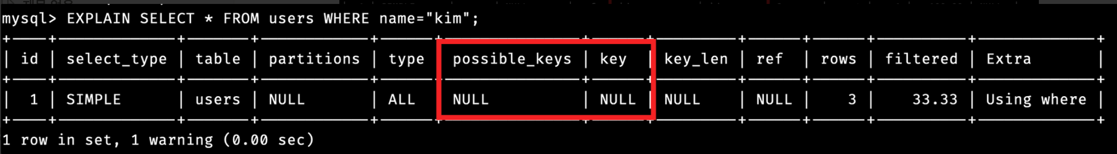 EXPLAIN SELECT * FROM users WHERE name="kim";