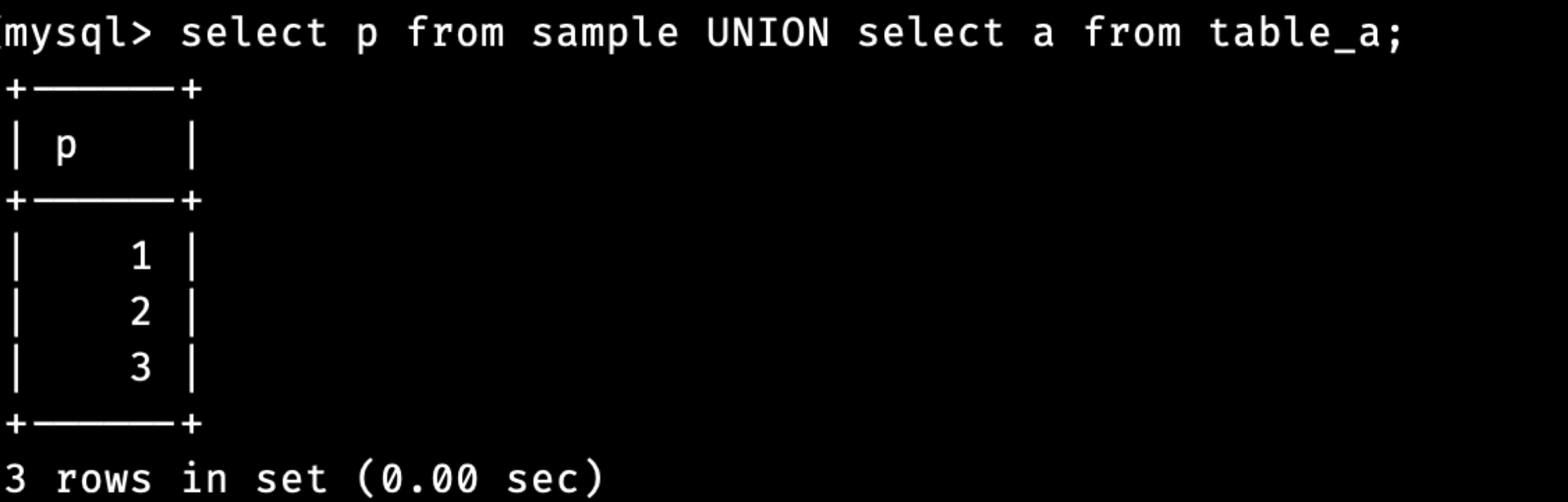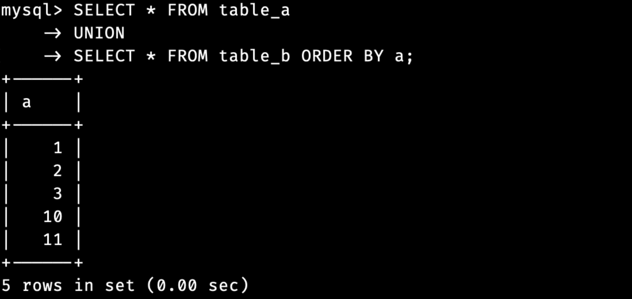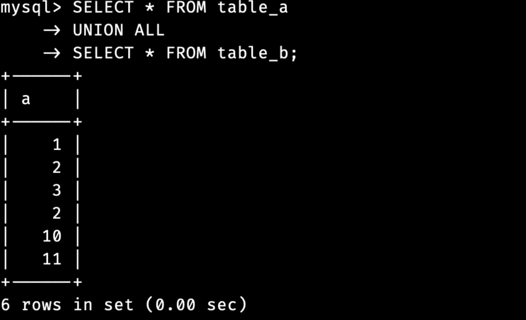 단, SELECT ALL을 사용한 것처럼 UNION에 DISTINCT를 붙여 UNION DISTINCT라는 문법은 허용되지 않습니다.