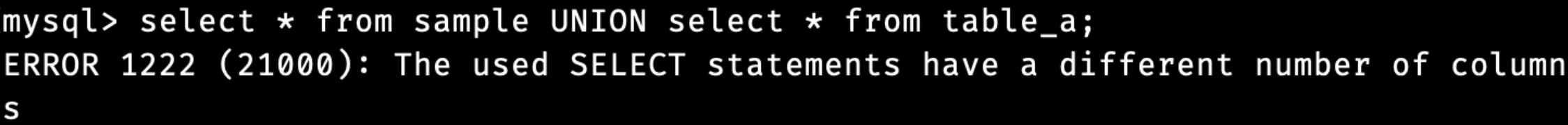 예를 들어 다음과 같이 열 구성이 완전히 다른 테이블은 UNION으로 묶을 수 없습니다.