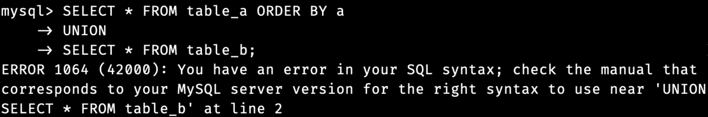 UNION으로 SELECT 명령을 결합해 합집합을 구하는 경우 각 SELECT 명령에 ORDER BY를 지정해 정렬할 수는 없습니다.