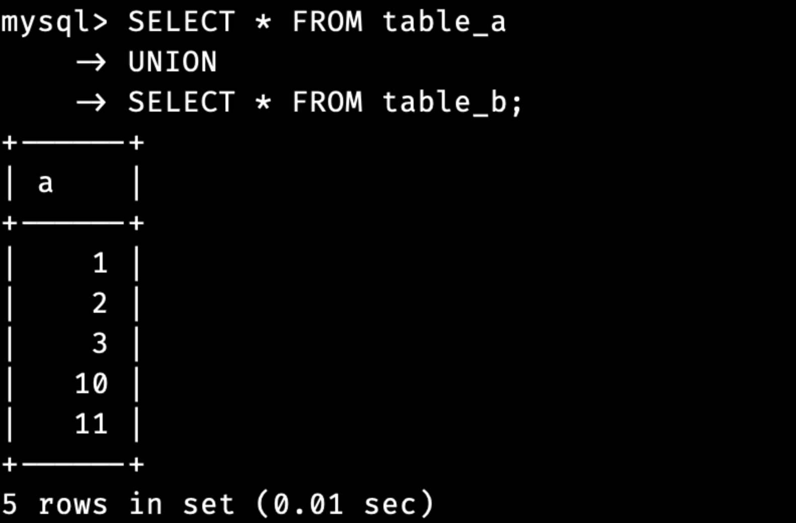단, SELECT ALL을 사용한 것처럼 UNION에 DISTINCT를 붙여 UNION DISTINCT라는 문법은 허용되지 않습니다.