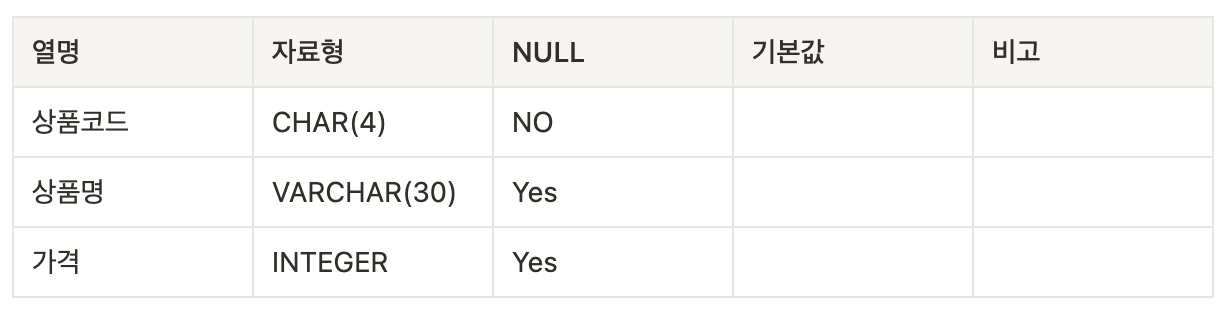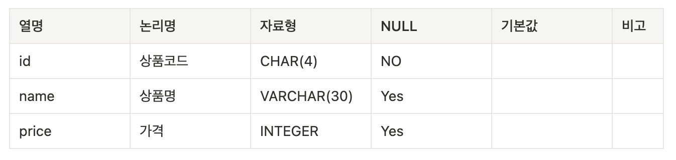 이때, 기본키가 되는 열부터 차례로 기술하며, 열 이름은 주로 논리명으로 표기합니다.