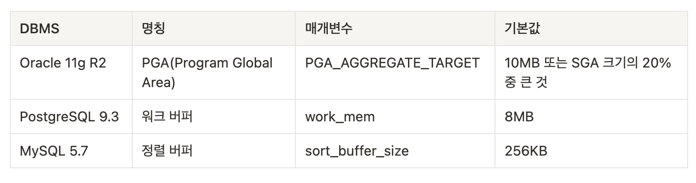 이 작업용 메모리 영역은 SQL에서 정렬 또는 해시가 필요한 때 사용되고 종료되면 해제되는 임시 영역으로, 일반적으로는 데이터 캐시와 로그 버퍼와는 다른 영역으로 관리되는 경우가 많습니다.