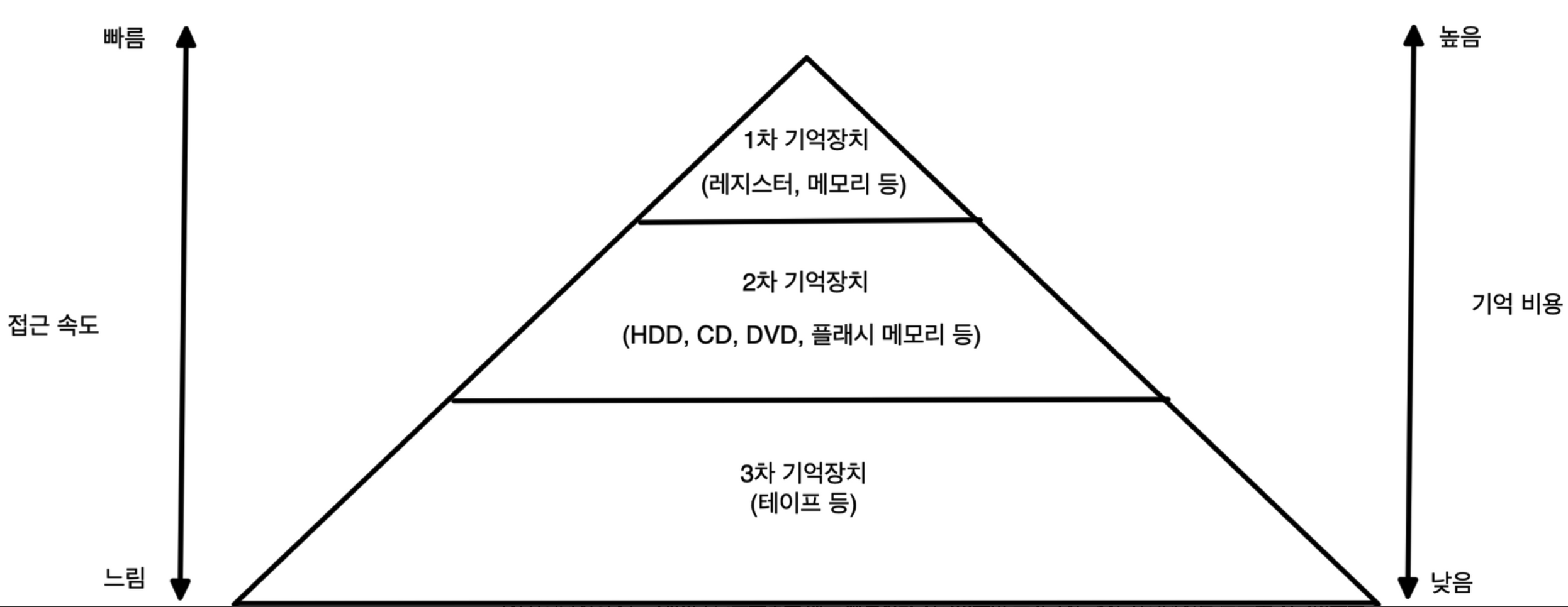 1차기억장치의 경우 데이터 접근속도는 매우 빠르지만 기억비용이 높고 2차, 3차 기억장치로 갈수록 기억비용은 낮아지지만 데이터 접근속도가 느려집니다.