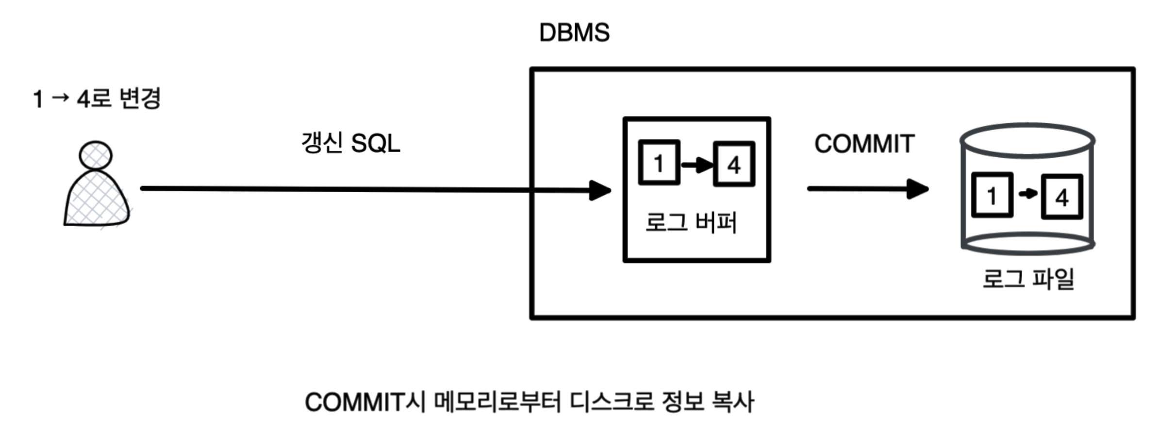 DBMS에서는 이를 해결하고자 커밋 시점에 반드시 갱신 정보를 로그 파일(영속적인 저장소에 있는)에 작성합니다.