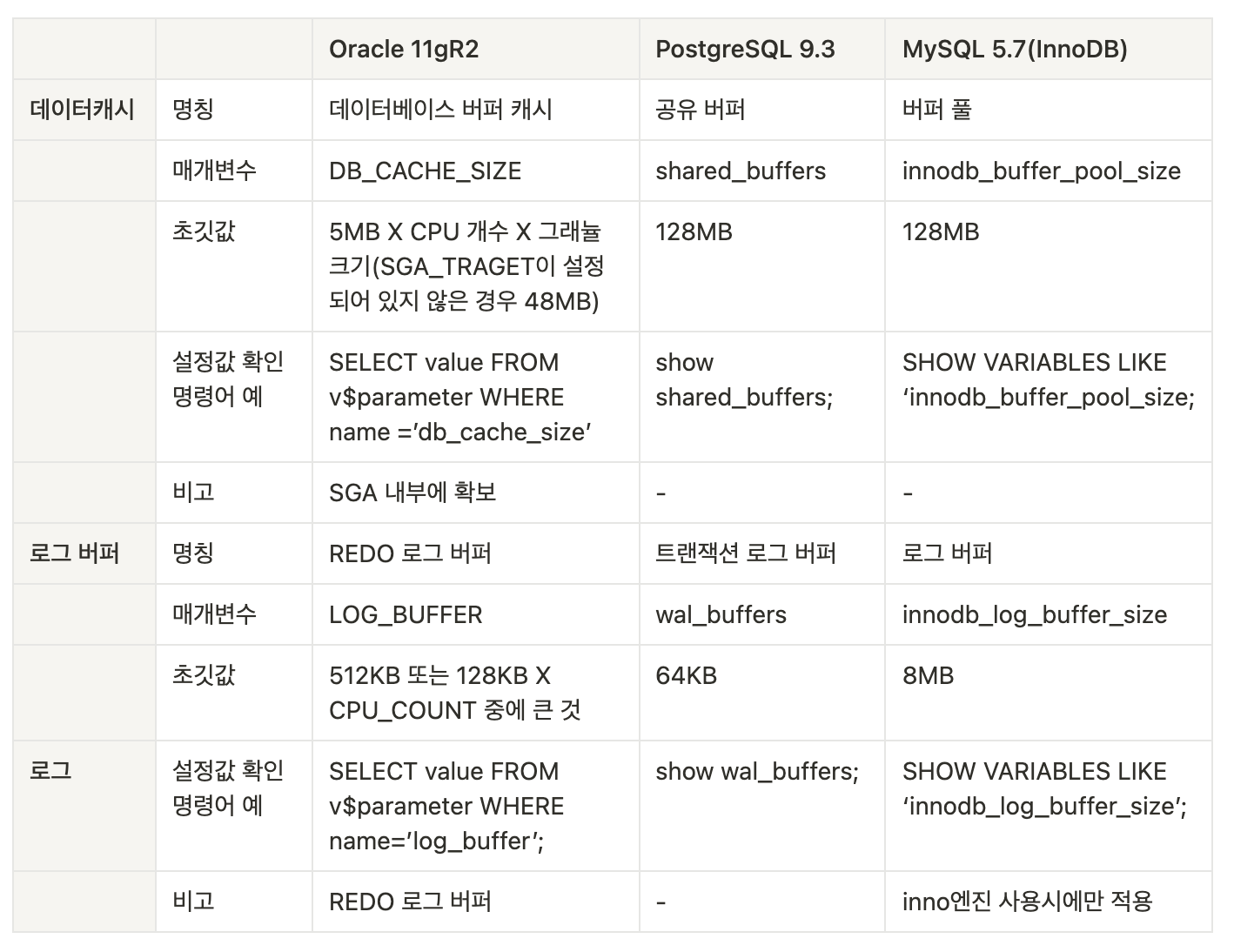 다음은 메모리 크기를 Oracle, PostgreSQL, MySQL을 예로 정리한 표입니다.