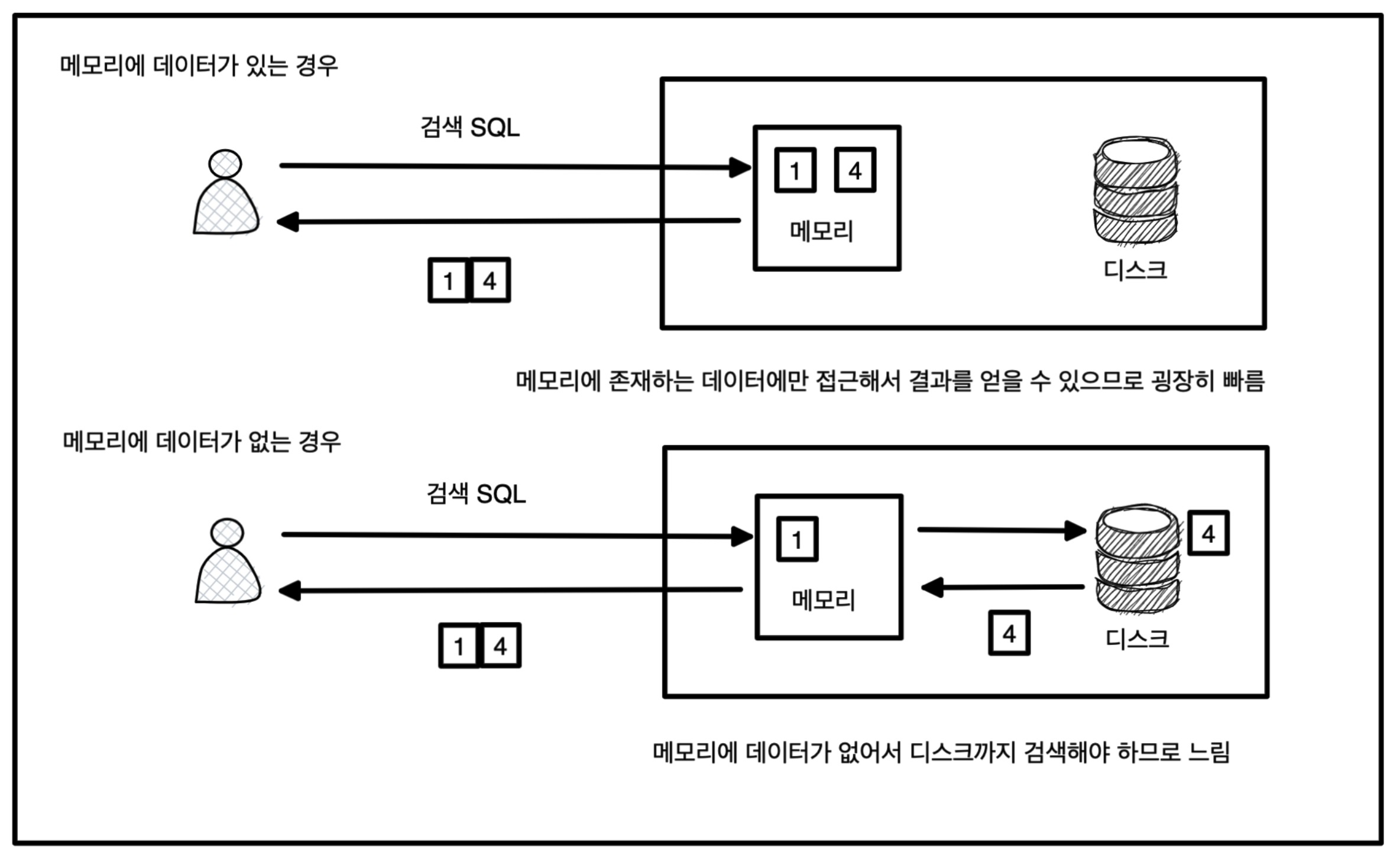 예를 들어, 자주 접근하는 데이터를 메모리 위에 올려두면 같은 SQL 구문을 실행한다고 해도 디스크에서 데이터를 가져올 필요 없이 곧바로 메모리에서 읽어 빠르게 데이터를 검색할 수 있습니다.