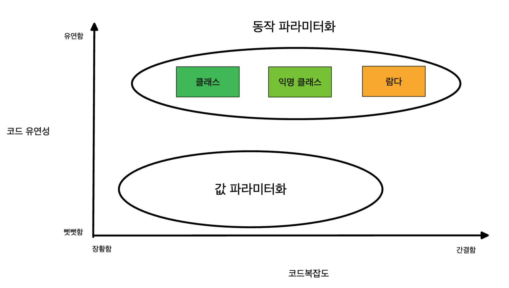 - 동작 파라미터화를 통해 내부 동작을 파라미터로 전달할 수 있기 때문에 변화하는 요구사항에 대응하기 쉬워집니다.